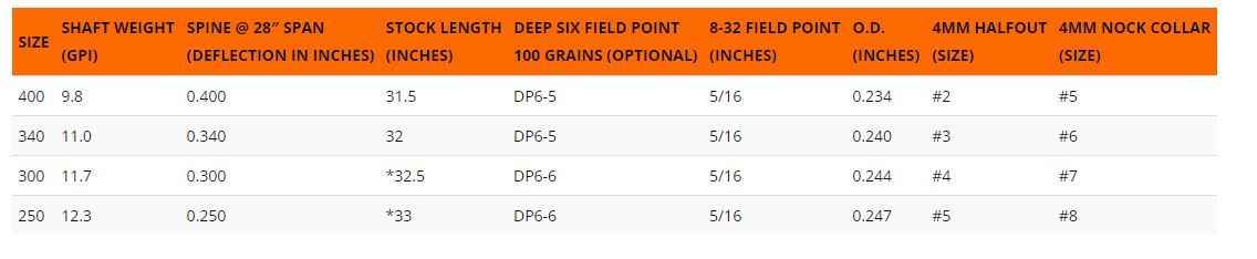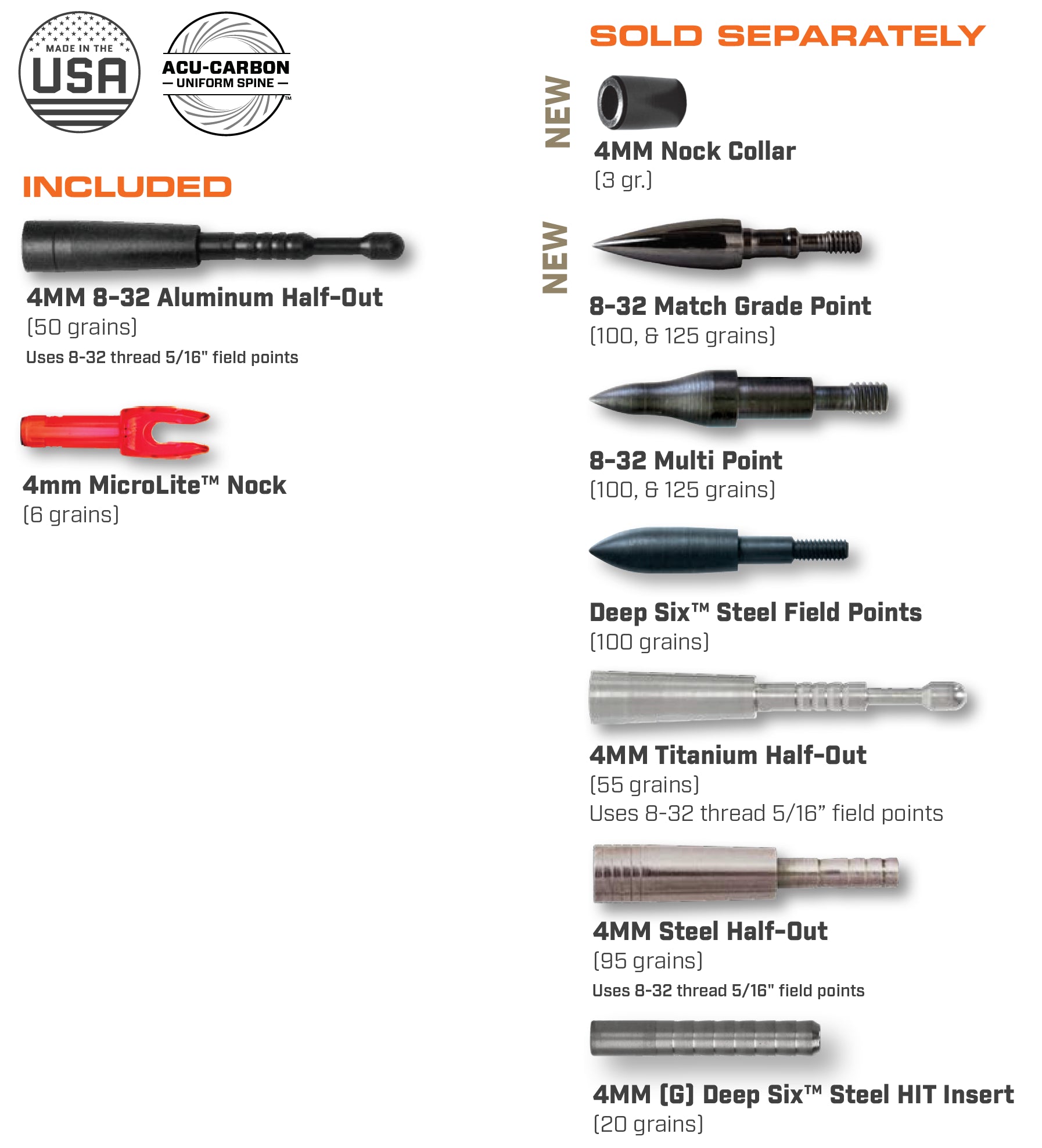 The 4MM FMJ offers the most penetration and is precision-made in USA for the most accurate hunting arrow on the market. The 4MM Full Metal Jacket has been updated with a new spine configuration, an all-new 8-32 point outsert system, and a redesigned graphics.  The standard 8-32 thread point outsert optimizes front-of-center for easier broadhead tuning and more durability.  FMJ starts with an advanced carbon core foundation for lightweight strength.  A full metal jacket adds kinetic energy, enhances accuracy, and pulls easier from targets. The combination provides the deepest penetration and more pass-through impacts for quicker kills and heavier blood trails.