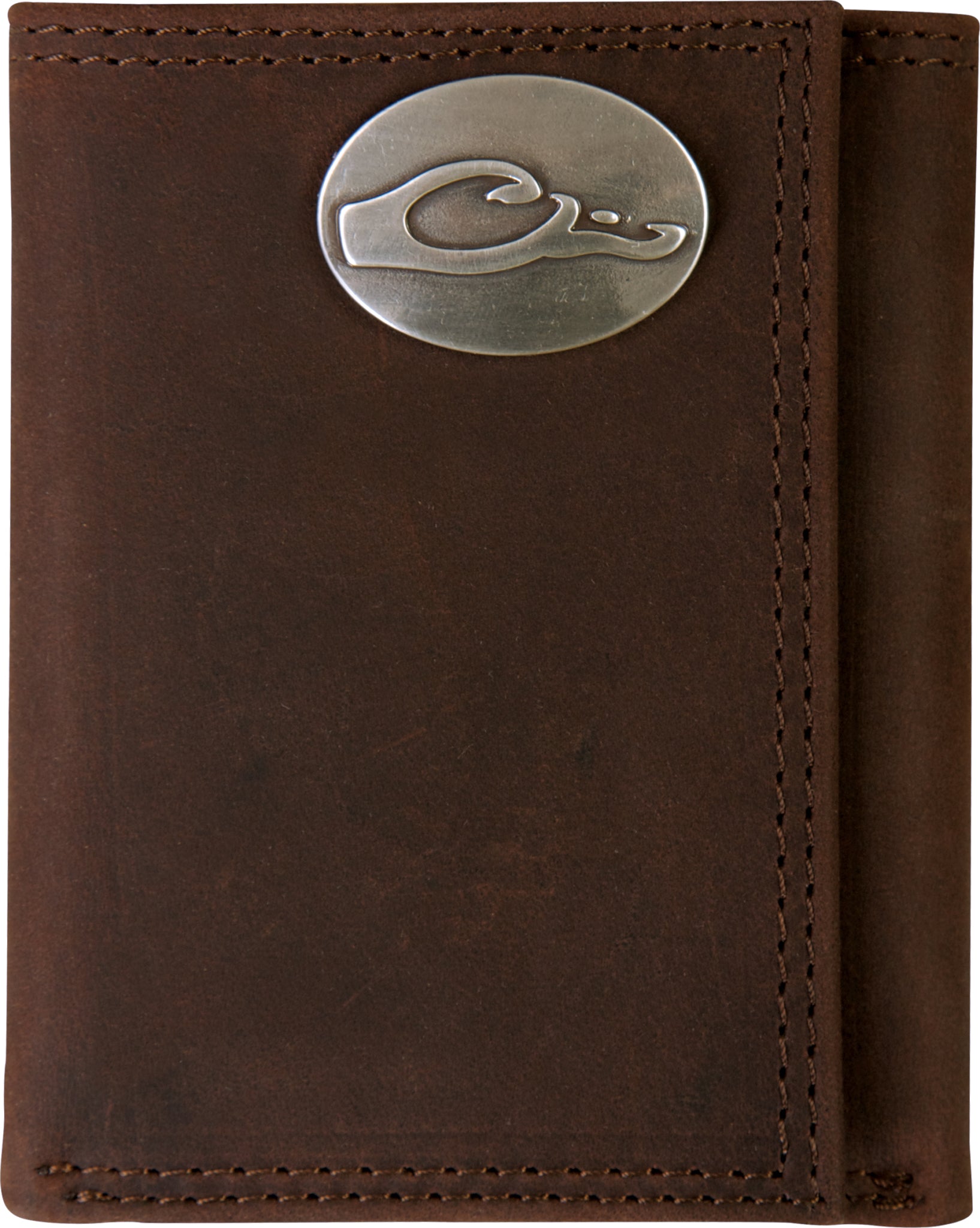 Brown Leather Tri-Fold wallet with the Drake Logo metal oval on the outside.