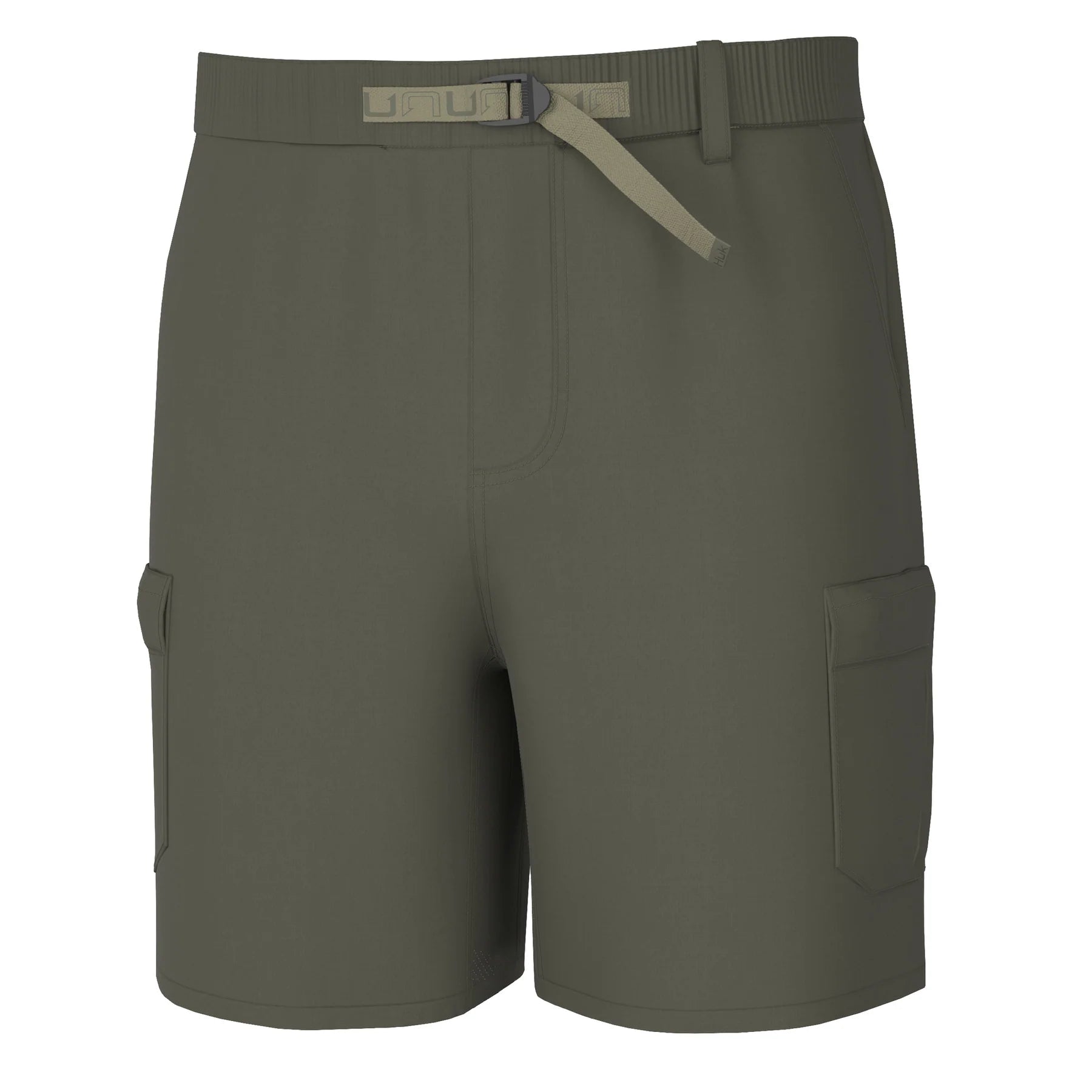 The Huk Creekbed Short features a faux fly front, a full elastic waistband with adjustable branded belt, hand pockets, and a secured back welt pocket, all treated with durable water repellent and anti-microbial properties.