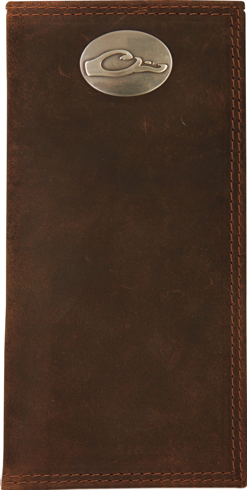 Brown Leather checkbook wallet with the Drake Logo metal oval on the outside.