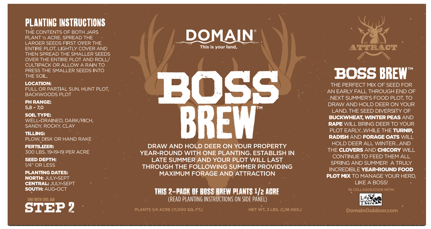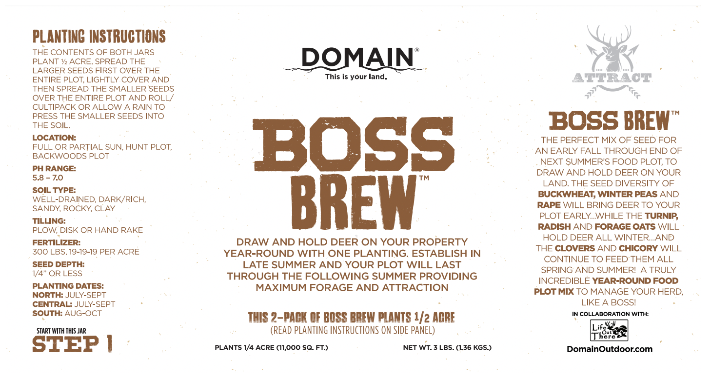 BOSS BREW IS THE PERFECT MIX OF SEED FOR AN EARLY FALL THROUGH END OF NEXT SUMMER’S FOOD PLOT (12 MONTHS OF FOOD WITH 1 PLANTING), DESIGNED TO DRAW AND HOLD DEER ON YOUR PROPERTY. THE SEED DIVERSITY OF BUCKWHEAT, WINTER PEAS AND RAPE WILL BRING DEER TO YOUR PLOT EARLY, WHILE THE TURNIP, RADISH AND FORAGE OATS WILL KEEP THEM THERE ALL WINTER…AND THE CLOVERS AND CHICORY WILL CONTINUE TO FEED THEM ALL SPRING AND SUMMER THE FOLLOWING YEAR. A TRULY INCREDIBLE YEAR-ROUND FOOD PLOT MIX TO MANAGE YOUR HERD, LIKE A BOSS!