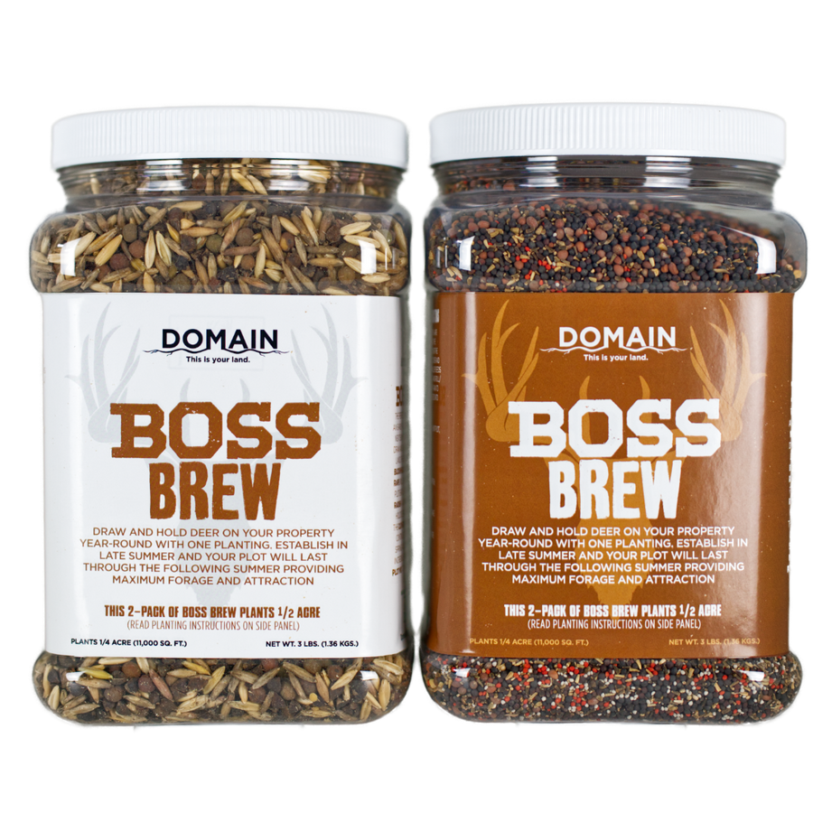 2 JUGS FOR THE PRICE OF ONE!!! BOSS BREW IS THE FIRST FOOD PLOT MIX OF IT’S KIND, WHERE SEEDS ARE SEPARATED BY SIZE, TO MAKE SEEDING YOUR PLOT EASIER AND MORE EFFECTIVE!