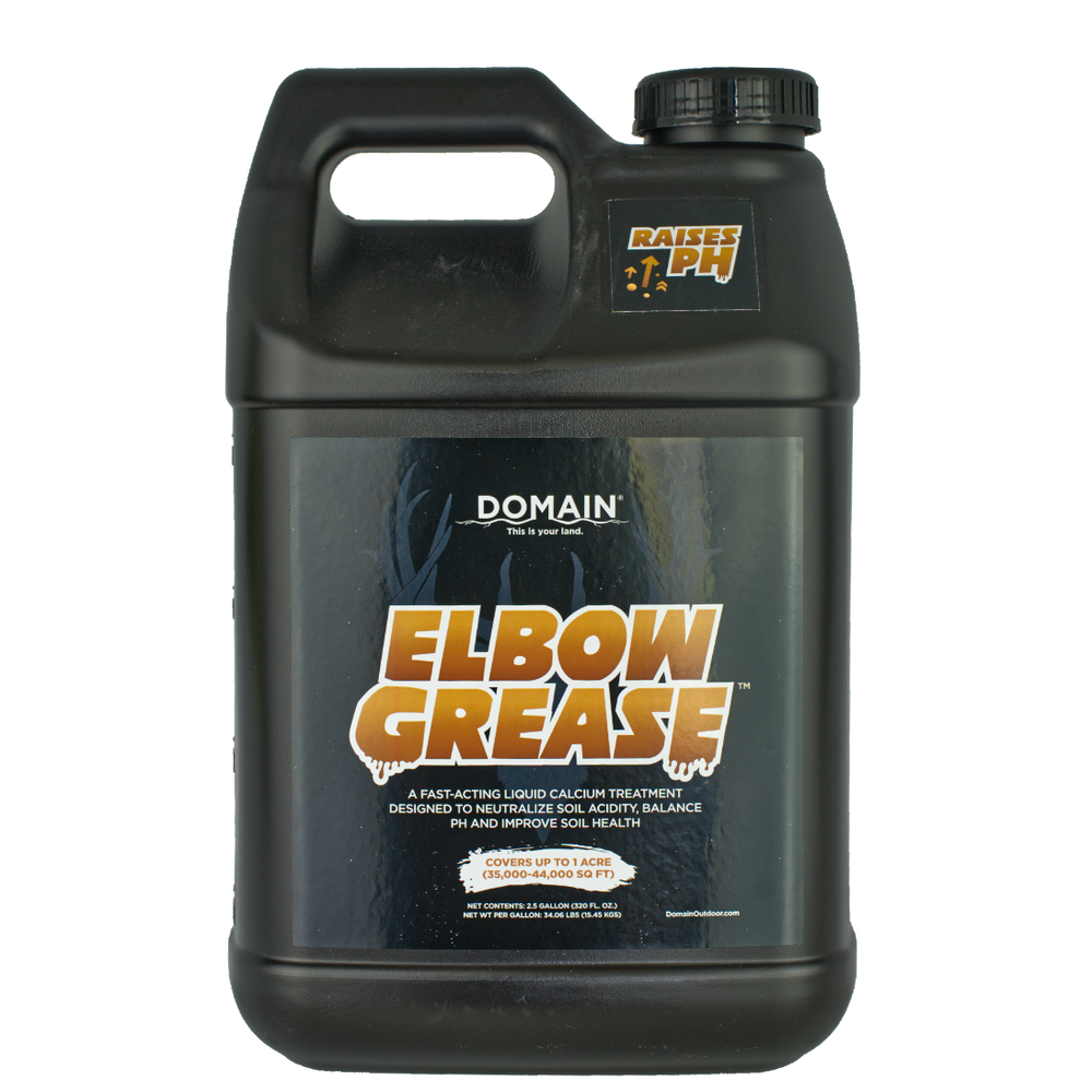 ELBOW GREASE™ IS A HIGH-IMPACT LIQUID CALCIUM (AKA LIQUID LIME) TREATMENT DESIGNED TO NEUTRALIZE SOIL ACIDITY, BALANCE PH AND SUPERCHARGE YOUR FOOD PLOTS. THIS POWERFUL LIQUID IS A "ONE PASS SOIL TREATMENT" THAT WILL HELP IMPROVE THE CALCIUM LEVELS, ELEVATE SOIL PH AND ALLOW YOUR PLANTS TO GROW AND THRIVE IN OPTIMAL SOIL CONDITIONS. 2-3 GALLONS (PER ACRE) MIXED WITH 15-20 GALLONS OF WATER SHOULD RAISE YOUR PH .7-1.0 POINTS AND SHOULD BE SPRAYED AFTER GROUND WORK IS DONE. PH WILL BEGIN CHANGING QUICKLY AFTER USE AND WILL REMAIN FOR SEVERAL YEARS AFTER APPLICATION. NO MORE HEAVY BAGS OF LIME (TONS AND TONS) OR LONG WAIT TIMES TO SEE YOUR PH LEVELS IMPROVE!! ELBOW GREASE™ IS INTENDED AS A SUPPLEMENT AND SHOULD BE USED IN CONJUNCTION WITH YOUR NUTRIENT MANAGEMENT PROGRAM.