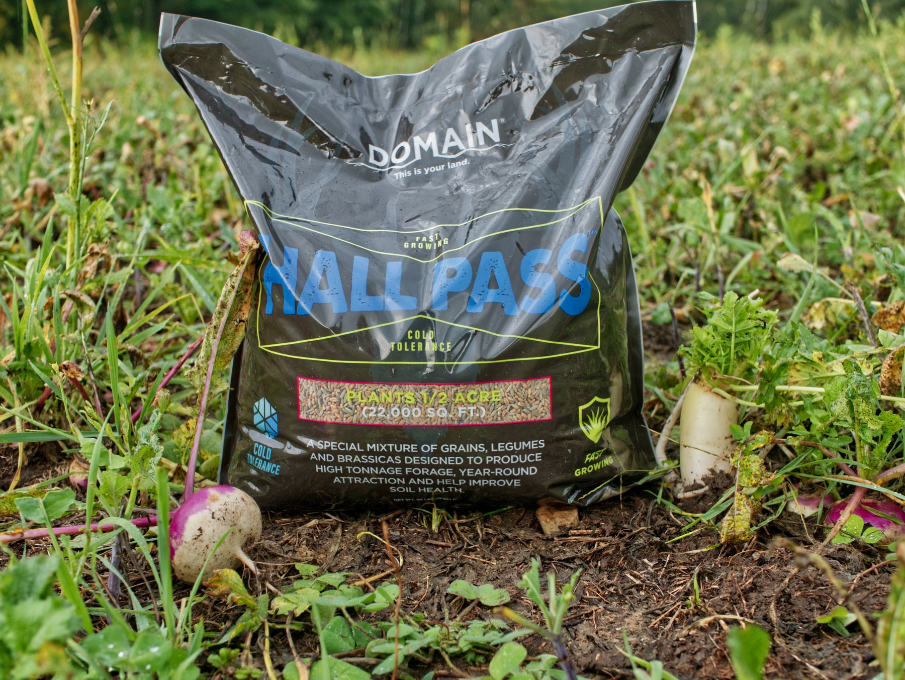 HALL PASS FOOD PLOT MIX OFFERS A SPECIAL COMBINATION OF GRAINS, LEGUMES AND BRASSICAS DESIGNED TO OFFER A HIGH TONNAGE FOOD SOURCE AND YEAR-ROUND ATTRACTION. HALL PASS CAN BE PLANTED LATE SUMMER THROUGH FALL AND IS DESIGNED TO GERMINATE, GROW AND ESTABLISH QUICKLY WITH MINIMAL MAINTENANCE. HALL PASS IS THE PERFECT OPTION FOR A HUNT OVER FALL FOOD SOURCE, LAST MINUTE FOOD PLOT OPTION, ROTATIONAL CROP OR OVERSEEDED INTO OVER-GRAZED BEANS OR CORN. WE’VE CREATED THE PERFECT RATIO TO ALLOW THIS DIVERSE BLEND OF PLANT VARIETIES TO MATURE AND GROW TOGETHER, PROVIDING THE PERFECT SMORGASBORD NO MATTER THE LOCATION OR CLIMATE. HALL PASS IS DESIGNED TO OFFER INCREDIBLE COLD TOLERANCE AND SOIL TOLERANCE AND YOUR DEER HERD AN INCREDIBLE FOOD SOURCE ALL FALL, WINTER AND SPRING TO HELP TURN YOUR “PROPERTY” INTO A “DOMAIN”.