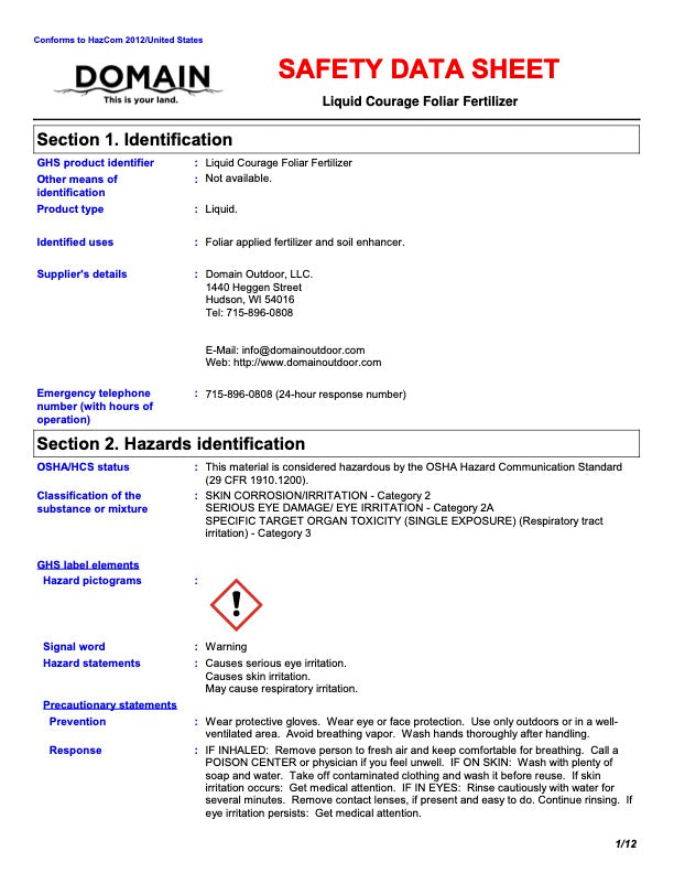LIQUID COURAGE™ FOLIAR FERTILIZER IS A CONCENTRATED FERTILIZER SOLUTION DESIGNED TO OPTIMIZE PLANT GROWTH, ENHANCE NUTRIENT UPTAKE AND MAXIMIZE FORAGE PRODUCTION. LIQUID COURAGE™ IS A FERTILIZER NUTRIENT SOLUTION DESIGNED FOR FOLIAR APPLICATION (SPRAYED ONTO PLANTS AND ABSORBED THROUGH LEAVES AND STEM) AND MUST BE DILUTED IN WATER BEFORE USE. LIQUID COURAGE™ IS RECOMMENDED AS A SUPPLEMENT TO A FERTILIZER PROGRAM AND ALSO CONTAINS SEVERAL STRAINS OF BENEFICIAL SOIL MICROBES AND MYCORRHIZAL FUNGI. APPLICATION OF THE COMPONENTS FOUND IN LIQUID COURAGE™ HAVE BEEN SHOWN TO OPTIMIZE NUTRIENT CONDITIONS FOR PLANT GROWTH CONTRIBUTING TO BETTER OVERALL PLANT SIZE AND YIELD. LIQUID COURAGE™ CAN BE SPRAYED ON ALL DOMAIN OUTDOOR FOOD PLOT PRODUCTS AND IS GREAT FOR CLOVERS, BRASSICAS, GRAINS, SOYBEANS AND CORN!