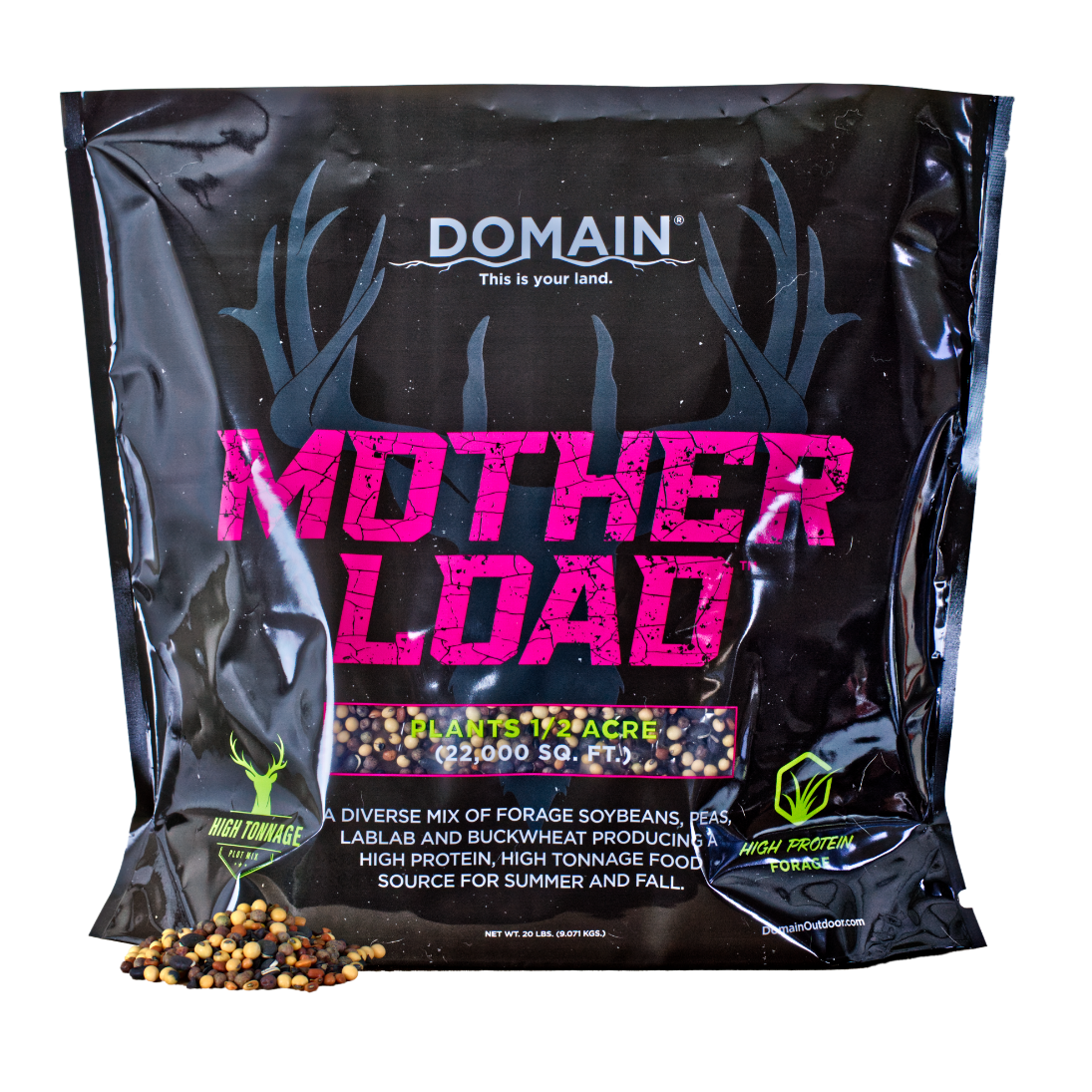 WITH IT’S EXCELLENT PLANT VERSATILITY YOU CAN PLANT IT IN THE SPRING FOR A HIGH PROTEIN SUMMER FORAGE OR PLANT IT IN THE SUMMER FOR A GREAT EARLY FALL HUNT PLOT. NO MATTER YOUR STRATEGY, MOTHERLOAD WILL HELP YOU FEED MORE DEER THIS SEASON AND HELP TURN YOUR “PROPERTY” INTO A “DOMAIN”.