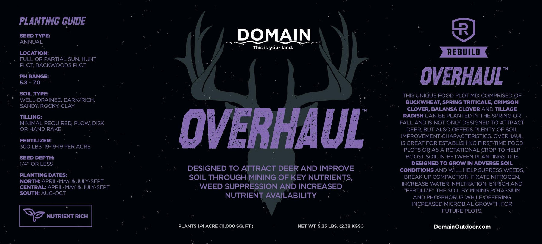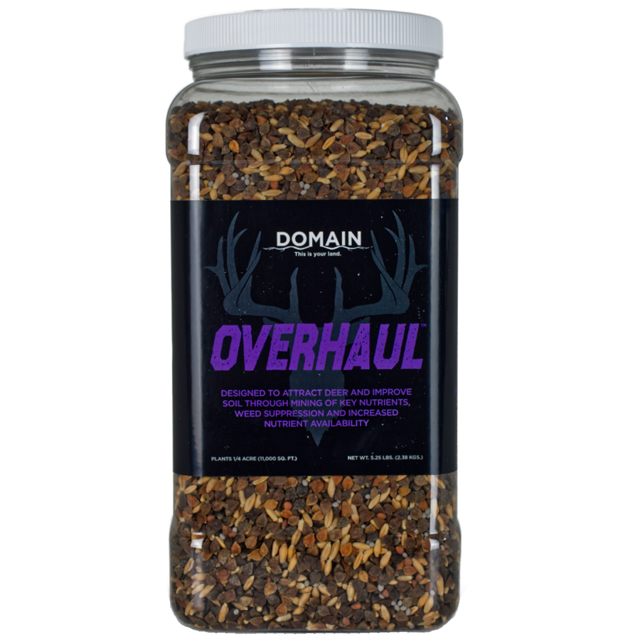 OVERHAUL IS A UNIQUE FOOD PLOT MIX COMPRISED OF BUCKWHEAT, SPRING TRITICALE, CRIMSON CLOVER, BALANSA CLOVER AND TILLAGE RADISH THAT CAN BE PLANTED IN THE SPRING OR FALL AND IS NOT ONLY DESIGNED TO ATTRACT DEER, BUT ALSO OFFERS PLENTY OF SOIL IMPROVEMENT CHARACTERISTICS AS WELL. BECAUSE OF ITS EASE OF USE AND DUAL PURPOSE OVERHAUL IS A GREAT PLOT FOR ESTABLISHING A FIRST-TIME FOOD PLOT LOCATION OR A ROTATIONAL CROP TO HELP BOOST THE SOIL IN-BETWEEN PLANTINGS. OVERHAUL CAN GROW IN ADVERSE SOIL CONDITIONS AND WILL HELP SUPPRESS WEEDS, BREAK UP COMPACTION, FIXATE NITROGEN, INCREASE WATER INFILTRATION, ENRICH AND “FERTILIZE” THE SOIL BY MINING POTASSIUM AND PHOSPHORUS AND OFFERS INCREASED MICROBIAL GROWTH FOR FUTURE PLOTS.