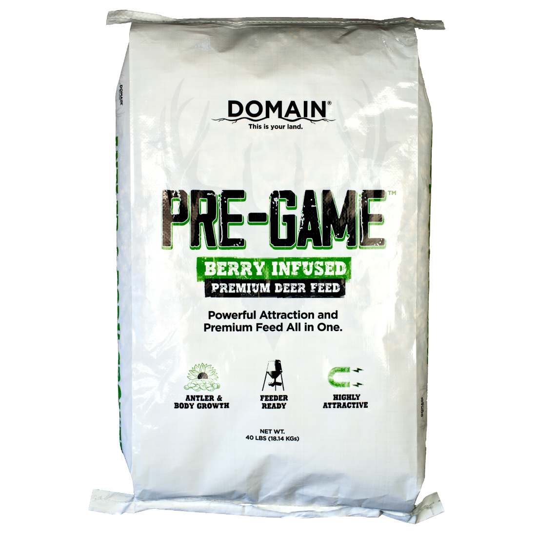 DOMAIN’S PRE-GAME PREMIUM DEER FEED IS A TEXTURED FEED DESIGNED TO ATTRACT AND FEED DEER ON A YEAR ROUND BASIS BY PROVIDING OPTIMAL LEVELS OF PROTEIN, ENERGY (FAT), VITAMINS AND MINERALS. IT IS A COMPLETE FEED PRODUCT THAT WILL AID IN IMMUNE SYSTEM SUPPORT, BODY GROWTH, ANTLER GROWTH AND OVERALL HEALTH OF YOUR HERD. PRE-GAME IS INFUSED WITH A SPECIAL NEWBERRY FLAVORING AND AROMA TO ENCOURAGE LONG RANGE ATTRACTION AND OFFER A FLAVOR PROFILE THAT WILL HAVE YOUR DEER BEGGING FOR MORE. PRE-GAME IS COMPRISED OF PROTEIN PELLETS, CORN, SUNFLOWER AND CRUSHED PLANT PROTEINS TO OFFER FLEXIBILITY IN HOW YOU FEED IT. IT CAN BE GROUND FED OR USED IN A VARIETY OF TROUGH OR GRAVITY STYLE FEEDERS. WITH IT’S RATIO OF PROTEIN TO ENERGY PRE-GAME WILL OFFER AN OPTIMAL FEED PRODUCT DURING GROWING SEASON TO HELP MAXIMIZE ANTLER GROWTH AND BE THE FOCUS OF ATTENTION WHEN WEATHER TURNS COLD IN THE FALL AND WINTER. PRE-GAME IS DESIGNED TO BE USED ON IT'S OWN BUT CAN ALSO BE ADDED TO CORN OR PROTEIN PELLETS AS A SUPPLEMENTAL FEED OFFERING.