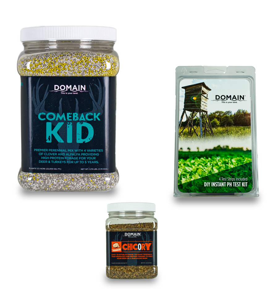 BY COMBINING SPECIAL VARIETIES OF CLOVER AND ALFALFA WE HAVE CREATED A PERENNIAL MIX THAT WILL ESTABLISH QUICKLY AND LAST UP TO 5 YEARS. COMEBACK KID CONTAINS 4 SPECIAL VARIETIES OF CLOVER AND 1 VARIETY OF ALFALFA TO CREATE AN ABSOLUTE DEER MAGNET PROVIDING FORAGES WITH PROTEIN LEVELS ABOVE 30%. WHEN YOUR CLOVER PLANTS BEGIN TO FLOWER IT SIGNALS THEIR MATURITY, MAKING IT A GREAT TIME TO MOW THE PLOT DOWN TO 6-8”. PERIODIC MOWING HELPS ELIMINATE UNWANTED WEEDS AND GENERATES RE-GROWTH OF THE CLOVER AND ALFALFA, KEEPING THEM STRONG AND HEALTHY.
