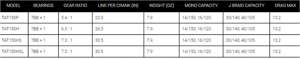The TATULA 150 Baitcasting Series is designed for specific bass fishing tasks like deep cranking, punching or flipping, pulling chatter baits or swimbaits, and frogging. With an aluminum side plate and frame and reinforced brass gearing and a sturdy pinion gear, these reels are designed for the more rigorous demands of power bass fishing. The T-WING level wind system allows line to pay out freely on casts and flips increasing distance and accuracy. The reel is Cadillac smooth utilizing an astounding 7 ball bearings and 1 roller bearing. Designed for a variety of presentations, the TATULA 150 comes in three gear ratios, 5.5 to 1 (right hand only), 6.3 to 1 and 7.3 to 1.