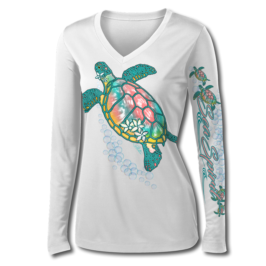 This Sea Spirit shirt is very cute, featuring Jason Mathias's illustration of a stylized Sea Turtle amongst bubbles, elegantly designed to enhance the figure is sure to catch the eye and the fish. fine art design is sublimated onto our superior technology that definitely makes for a top favorite among woman anglers world wide!