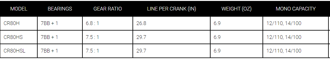 The CR80 is a Carbon Resin frame casting reel that delivers unbelievable performance in a very palm-able ergonomic light weight design.