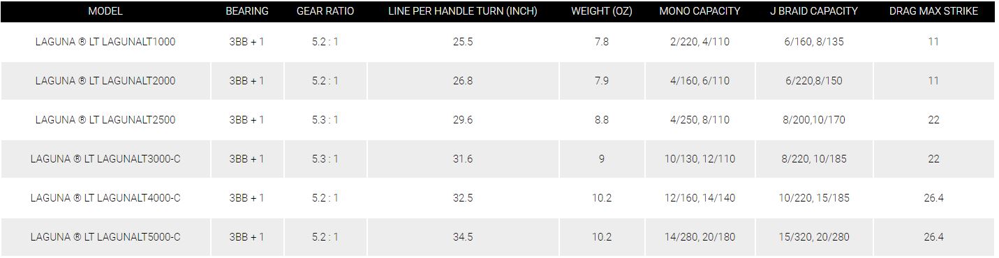 The Laguna LT is the latest manifestation in Daiwa's LT storyline. The redesigned reel embraces the LT Concept of light and tough. The True Carbon Frame reduces weight and size yet is as rigid as conventional materials. The reel weight has been reduced from 7.9 ounces to 6.7 oz. in the 1000 series and 10.6 oz. to 7.6 oz. in the 3000 series.