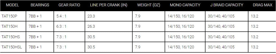 The TATULA 150 Baitcasting Series is designed for specific bass fishing tasks like deep cranking, punching or flipping, pulling chatter baits or swimbaits, and frogging. With an aluminum side plate and frame and reinforced brass gearing and a sturdy pinion gear, these reels are designed for the more rigorous demands of power bass fishing. The T-WING level wind system allows line to pay out freely on casts and flips increasing distance and accuracy. The reel is Cadillac smooth utilizing an astounding 7 ball bearings and 1 roller bearing. Designed for a variety of presentations, the TATULA 150 comes in three gear ratios, 5.5 to 1 (right hand only), 6.3 to 1 and 7.3 to 1.