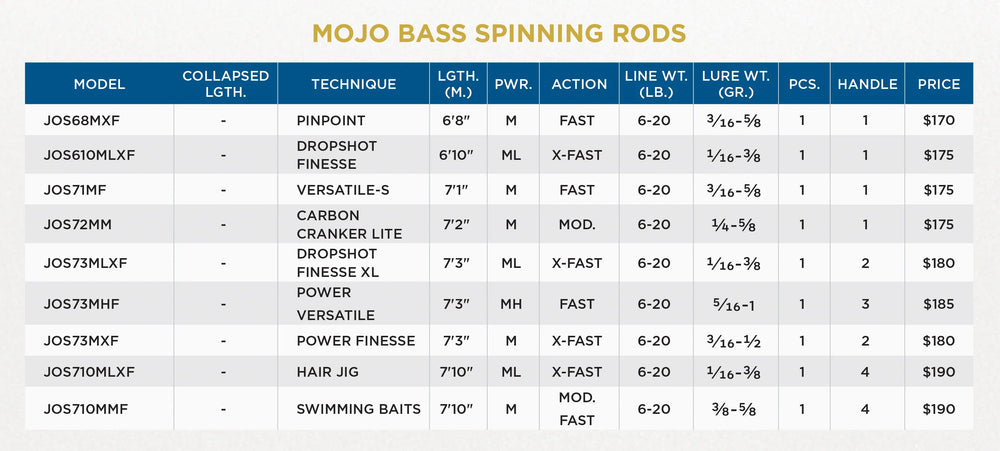 Updated with modern cosmetic appeal and St. Croix’s latest technological innovations, the St. Croix Mojo Bass Trigon Spinning Rods once again put legendary performance in rod lockers without breaking the budget. The Mojo Trigon series is founded with premier SCIII carbon fiber blanks constructed using St. Croix’s Fortified Resin System to provide anglers with exceptional sensitivity and the strength to back it up. Anchored to the blanks are stainless steel guides with aluminum-oxide inserts to generate long, quiet casts without weighing the rods down.