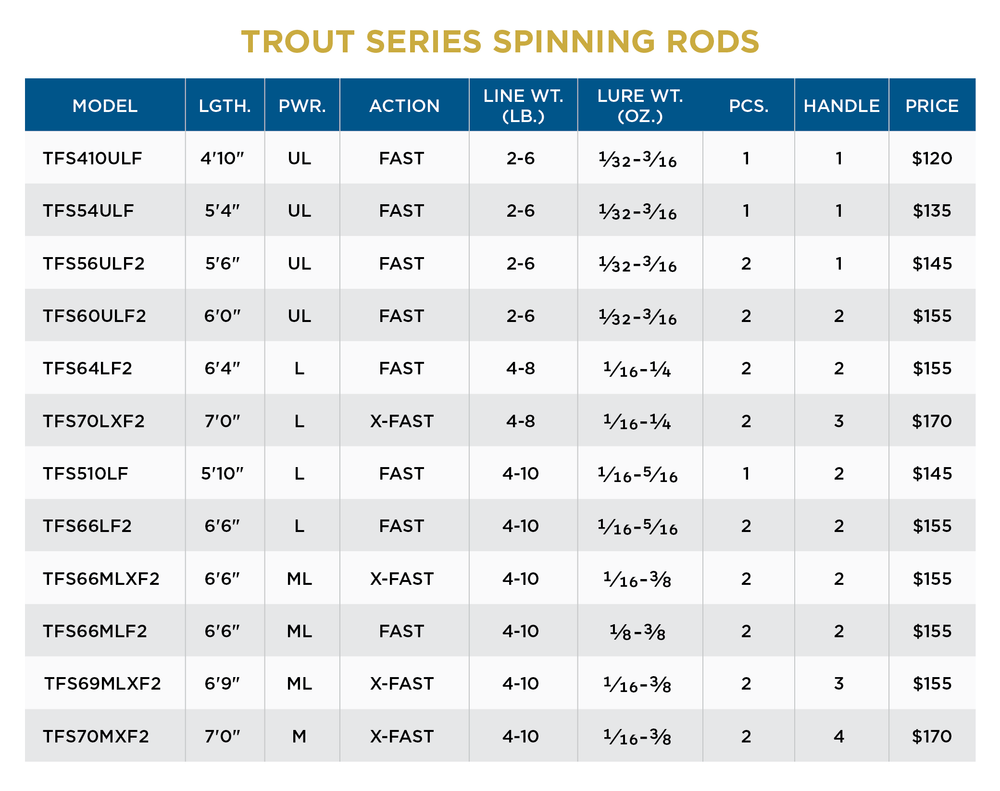 Trout specific spinning rods built for durability. Slim profile split grip handle configurations decrease weight while perfecting balance. Trout Series brings an array of lengths, powers, and specific actions to anglers looking for sensitivity, controlled performance and casting accuracy casting light lures.