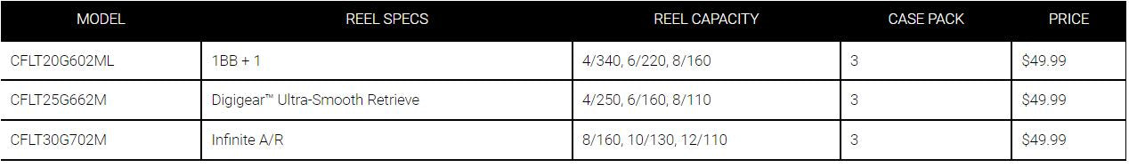 The all-graphite rod comes with cork handles where the ultra-smooth Crossfire LT is smooth with the 1+1 bearing design. Rod lengths are 6', 6' 6" and 7'.
