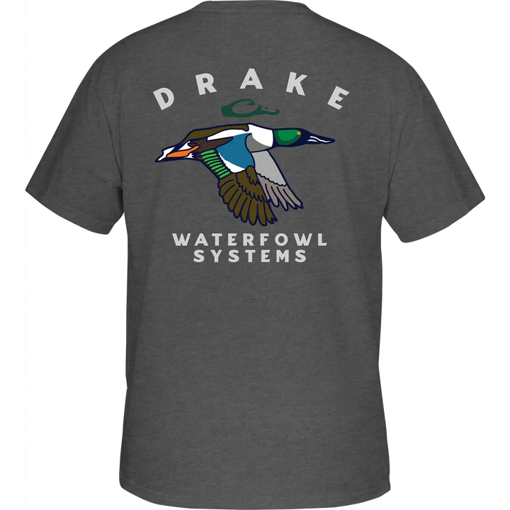 The Drake Waterfowl Graphic Tee is constructed with a 60% cotton and 40% polyester blend which supplies softness and comfort. The Drake Waterfowl Graphic Tee has a Drake logo on the front pocket and depicts a Northern Shoveler from our Retro Series of back graphic tees.