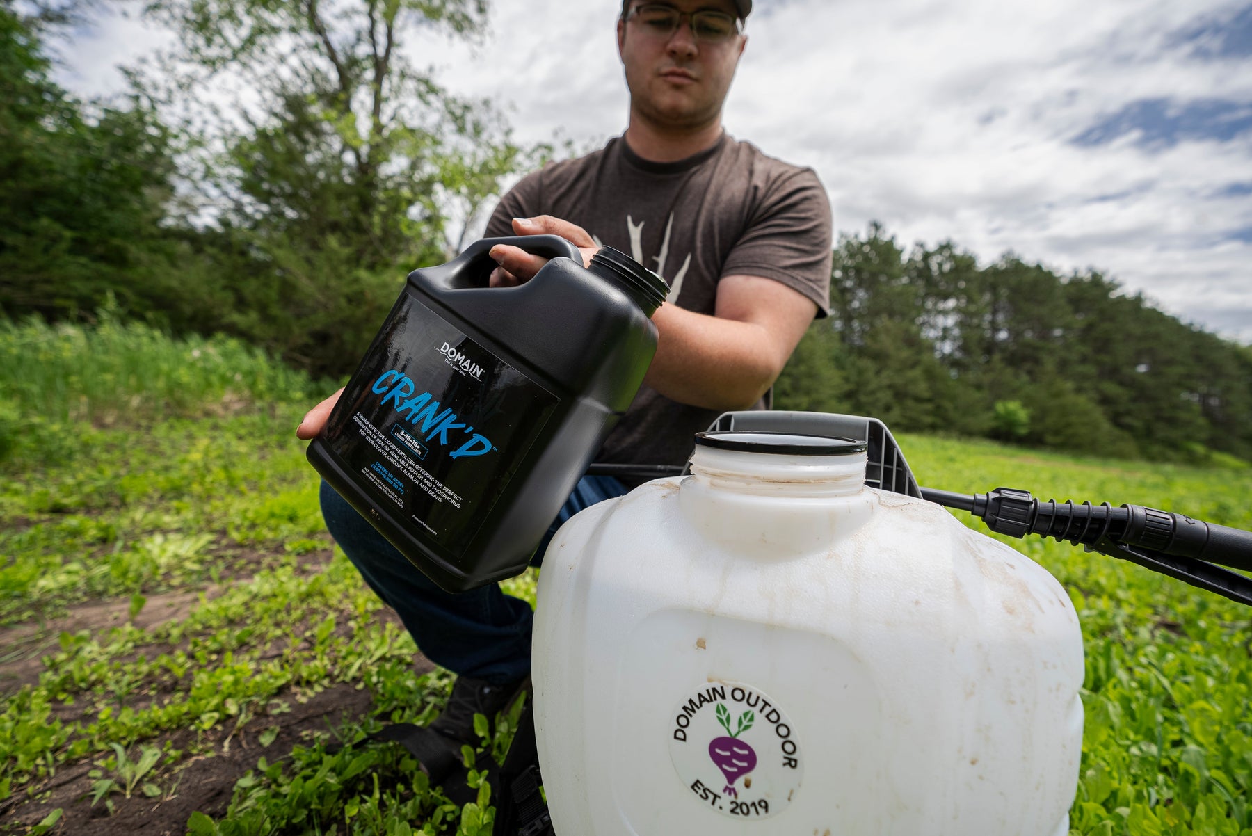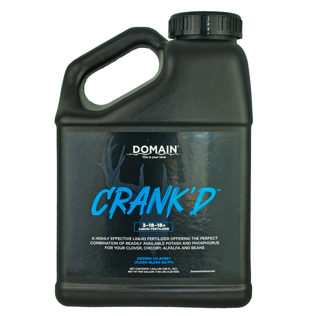 CRANK'D™ 3-18-18+ ORTHO-PHOSPHATE LIQUID FERTILIZER IS A POWERFUL AND ECONOMICAL BLEND PERFECT FOR APPLICATION PRIOR TO PLANTING OR DURING VARIOUS STAGES OF FOOD PLOT GROWTH.  THIS COMBINATION OF READILY AVAILABLE POTASH AND PHOSPHORUS MAKES IT THE IDEAL FERTILIZER SOLUTION FOR CLOVERS, CHICORY OR BEANS.  CRANK'D™ 3-18-18+ IS ALSO COMPATIBLE WITH FREIGHT TRAIN™ AND CAN BE MIXED TO MAKE THE PERFECT SOLUTION FOR YOUR BRASSICA FOOD PLOTS!  CRANK'D™ 3-18-18+ HAS A SOIL LIFE OF ONE GROWING SEASON WITH ONE APPLICATION AND IS DESIGNED TO PROVIDE READILY AVAILABLE NUTRIENTS DIRECTLY TO THE PLANT AND IS ABSORBED THROUGH BOTH THE ROOTS AND LEAVES.  GROUND ABSORPTION PROVIDES SLOW RELEASE AND LIVES IN YOUR SOIL FOR ONE GROWING SEASON, WHEREAS ANYTHING THAT HITS THE PLANT WILL BE ABSORBED IN THE FIRST 24 HOURS FOR QUICK BOOST OF NUTRIENTS. THE SMALL AMOUNT OF NITROGEN FOUND IN CRANK'D™ ACTS AS A CARRIER AGENT AND HELPS PROVIDE A BOOST IN NATURAL NITROGEN PRODUCTION IN THE PLANT.  THE ORTHO-PHOSPHATE FORM OF PHOSPHORUS ELIMINATES THE BREAKDOWN TIME AND OFFERS READILY AVAILABLE PHOSPHORUS IN THE EARLY STAGES OF GROWTH WHEN IT IS NEEDED MOST.   CRANK'D™ 3-18-18+ PROVIDES YOUR FOOD PLOT 6-7 TIMES THE AVAILABILITY OF FERTILIZER VERSUS GRANULAR FERTILIZER.  CRANK'D™ 3-18-18+ IS INTENDED AS A SUPPLEMENT AND SHOULD BE USED IN CONJUNCTION WITH YOUR NUTRIENT MANAGEMENT PROGRAM.