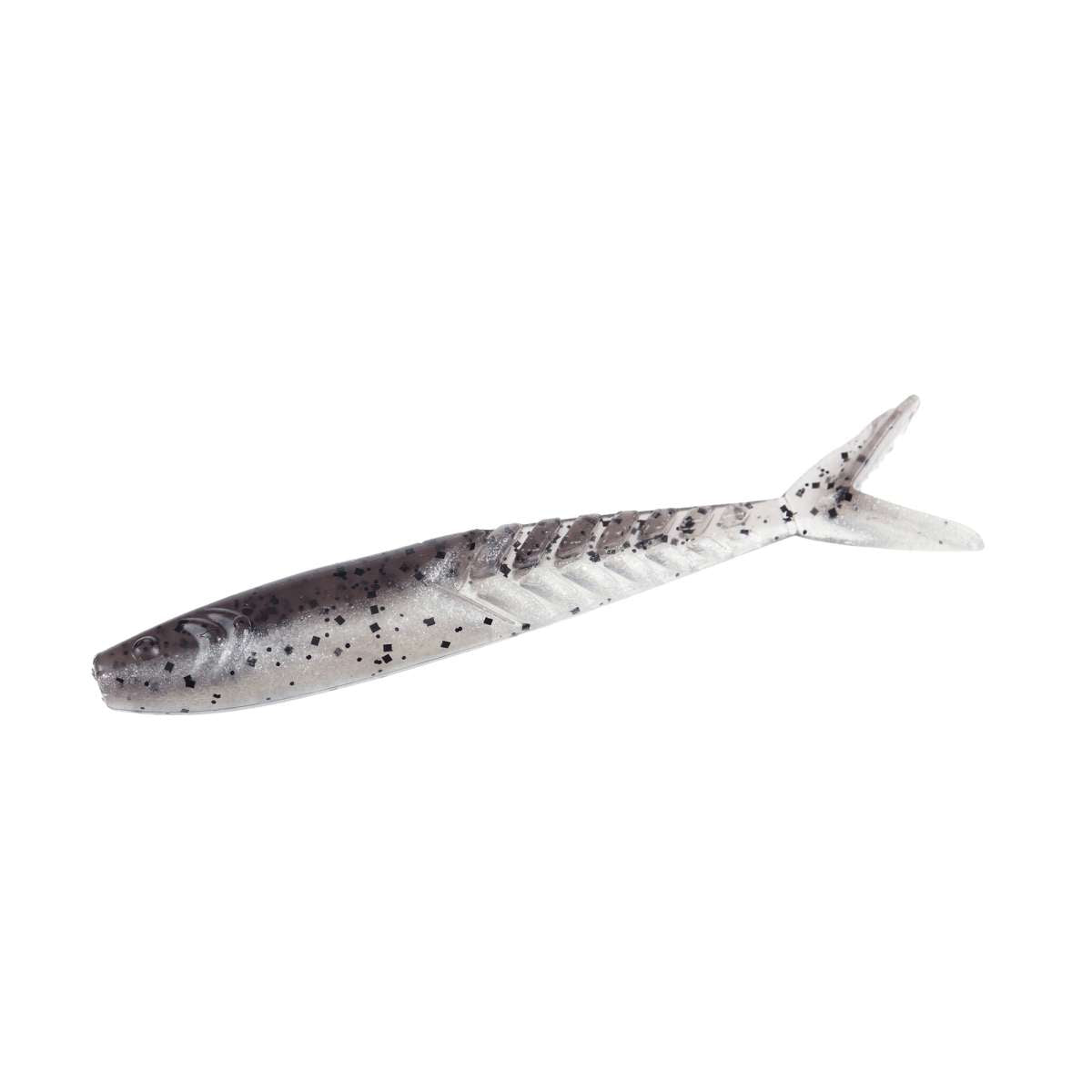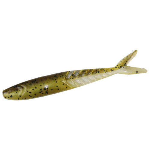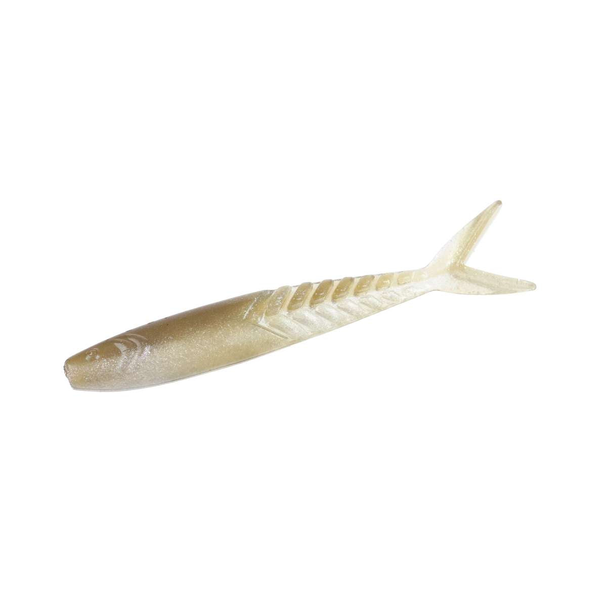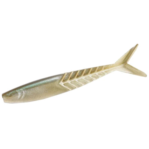 The Shimmer Shad has the classic slim baitfish design, ribbed skeleton rear section and forked tail that quiver at any speed. Their uses are only limited by your imagination. The primary usage to date has been as a trailer for a bladed jig, spinnerbait or buzzbait, but they excel when fished alone and the smallest size is deadly on a dropshot or a small jig head in coordination with forward-facing sonar. Available in three sizes, 4.25", 3.6", and 3.0".