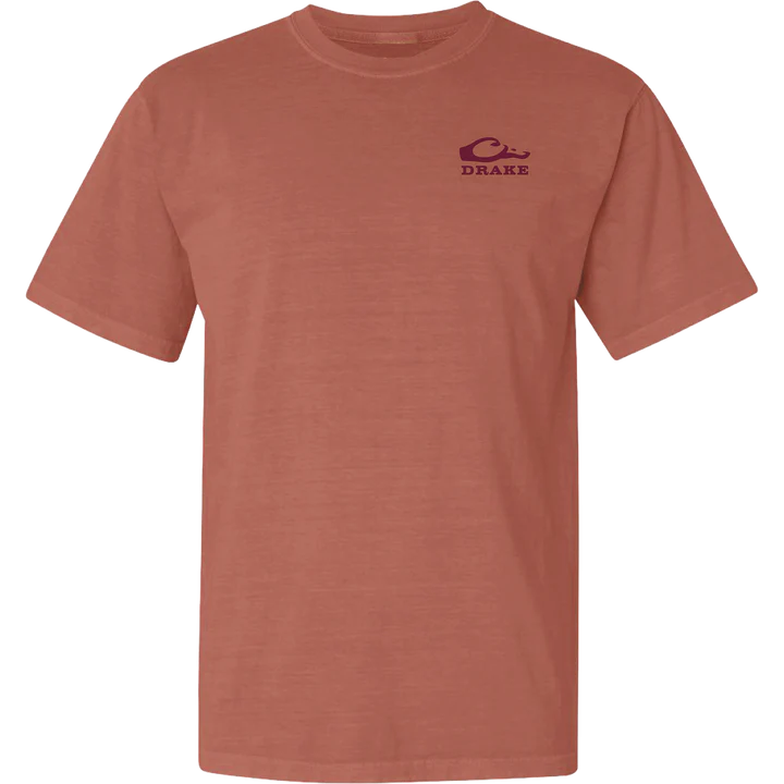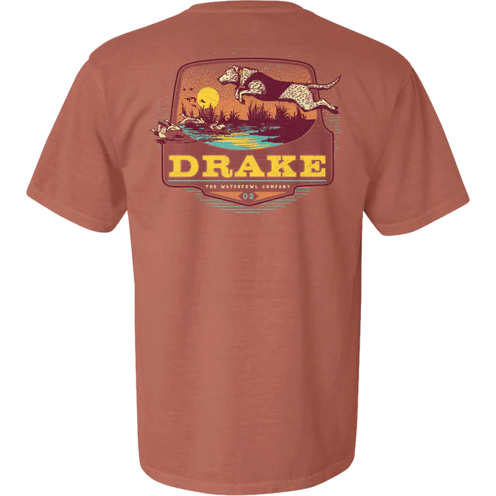 The Drake Waterfowl Cotton Graphic Tee is constructed with 100% Cotton for a soft, comfortable hand feel. This Drake T-shirt is non-pocketed, has a Drake logo on the front left chest, and depicts a Lab in the marsh watercolor graphic. From our Drake Cotton Series of back graphic tees.