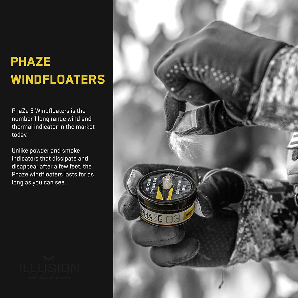 When it comes to hunting big game, proper scent control and understanding how scent travels though terrain at a distance is crucial to success. PhaZe Windflaoters accurately show your invisible downwind scent path, exposing updrafts, downdrafts and thermals that Powder and Smoke based products simply can't reach.