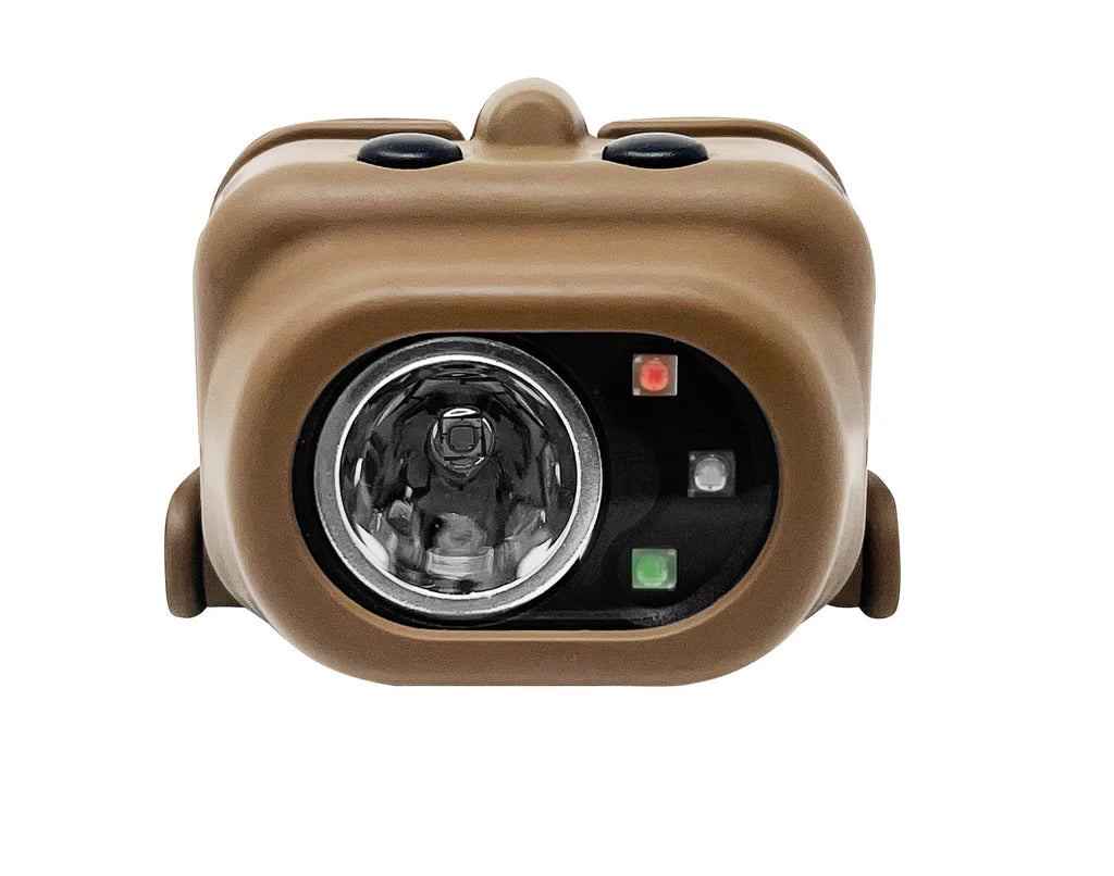 This 3 AAA multi-function flat dark earth headlamp with camo strap features a multi-position tilt head design and includes an elastic head strap with a non-slip lining. The top-mounted dual switches provide a high/low-brightness spotlight for distance illumination and white/red/green floodlight operation for illuminating objects that are close by. Power comes from three AAA batteries (included).